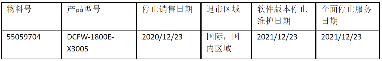 北京kdpay钱包官网数码云科信息技术有限公司正式通知您, 以上DCFW-1800E-X3005下一代防火墙(55059704)将于2020年12月23号停止接收新的订单(具体日期见上表),不再供货。给您带来的不便,敬请原谅。